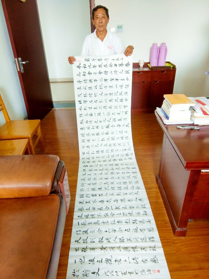 淮海農場中學退休教師陳必祥是中國書畫家協會理事,多年來他潛心研究書法,作品多次獲得國家和省、市、縣大獎。為了臨摹好王羲之的行書《蘭亭序》書法,陳必祥預先在報紙上把《蘭亭序》上的324個字逐一練習30遍,并在全面掌握其中每一個字體的章法、結構和筆法后,陳必祥用了一天的時間,終于臨摹完成了王羲之的這幅《蘭亭序》作品。