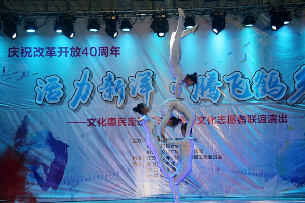 演出在開場舞《盛世歡歌》中拉開帷幕,女生獨唱《美麗的丹頂鶴》、舞蹈《吉祥》、雜技《肩上芭蕾》、魔術《千變萬化》等節目形式多樣、層次分明,一曲曲優美的歌聲、一段段賞心悅目的舞蹈、一場場精彩絕倫的雜技表演……將現場氛圍漸漸推向高潮,最后,演出在舞蹈《美麗射陽》中落下帷幕。