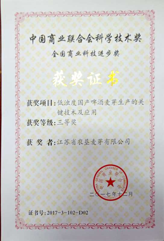 大會(huì)同時(shí)發(fā)布了2016年和2017年中國(guó)商業(yè)聯(lián)合會(huì)科學(xué)技術(shù)獎(jiǎng)、服務(wù)業(yè)科技創(chuàng)新評(píng)獎(jiǎng)結(jié)果,以及2017年全國(guó)商業(yè)質(zhì)量獎(jiǎng)、零售企業(yè)服務(wù)質(zhì)量獎(jiǎng)五星級(jí)單位。蘇墾麥芽公司《低濁度國(guó)產(chǎn)啤酒麥芽生產(chǎn)的關(guān)鍵技術(shù)及應(yīng)用》獲得全國(guó)商業(yè)科技進(jìn)步獎(jiǎng)三等獎(jiǎng)。