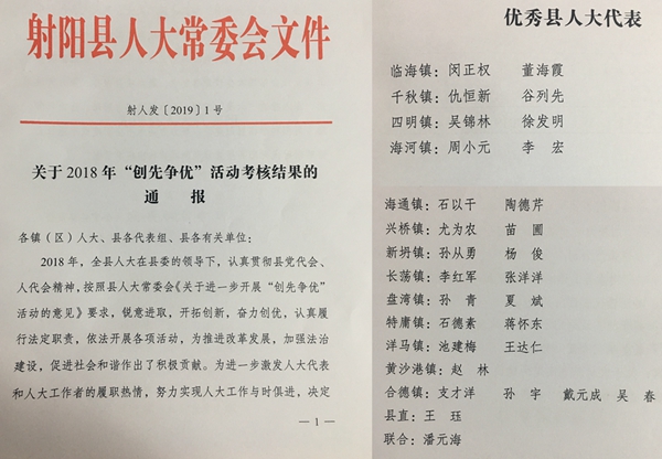 據射陽縣人大常委會文件射人發[2019]1號《關于2018年“創先爭優”活動考核結果的通報》獲悉,新洋農場有限公司董事長、總經理潘元海獲“優秀縣人大代表”榮譽稱號。