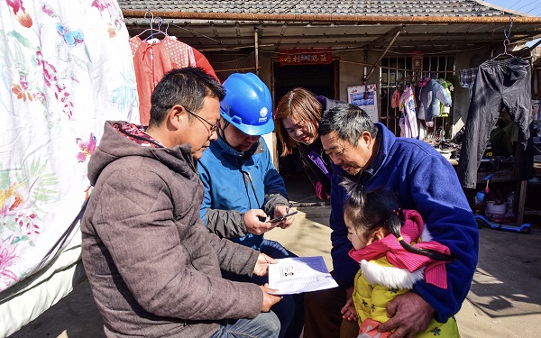 (圖為縣供電公司員工在職工居民家中辦理用戶(hù)過(guò)名業(yè)務(wù))