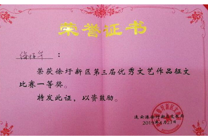 (東辛徐恒華獲得徐圩新區第三屆優秀文藝作品一等獎榮譽證書)