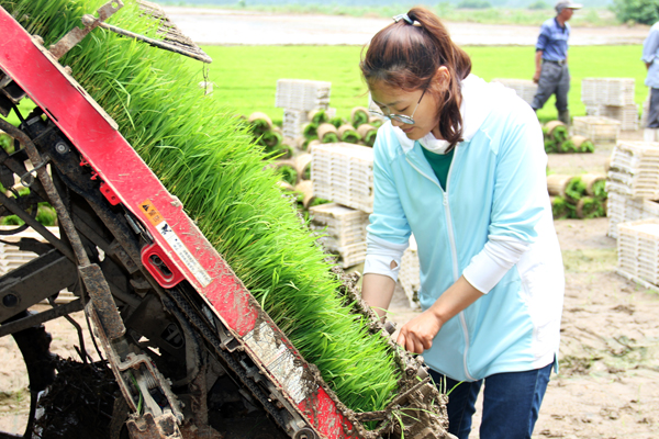 第六生產(chǎn)區(qū)20連秧池里,插秧機正在裝秧,劉涵抓住滿是爛泥的插植臂一一檢查,“你這里有兩個彈簧松了,車上帶配件了吧?!我來幫你換。”“前幾天才換過的”駕駛插秧機的駕駛員有些嘴犟,打轉方向盤想下田。“不行,你不換了這兩根彈簧就停止栽插!”小劉泗洪口音里帶著點北方人的硬氣。水稻栽插到了關鍵時刻,要在三夏指揮部規(guī)定時間內完成栽插任務,就目前這個進度有點困難。劉涵在抓進度的同時對質量也絲毫不放松,她負責第三、第六兩個生產(chǎn)區(qū)的質量檢查工作,兩邊跑來跑去,對一個女同志來講確實有點困難,但是北方人認真的勁頭,硬是讓劉涵頂下來了。第三生產(chǎn)區(qū)的插秧機,她會在晚上下班之前用秧規(guī)校正好,早上,趕在開工前將第六生產(chǎn)區(qū)的插秧機全部校正一遍。插秧機每天滿負荷工作,配件特別是秧針容易損壞,劉涵在水稻田里巡查一下,根據(jù)田里水稻栽插情況很快就能判斷出插秧機的故障,直到故障排除,她才會趕到下一個栽插點。