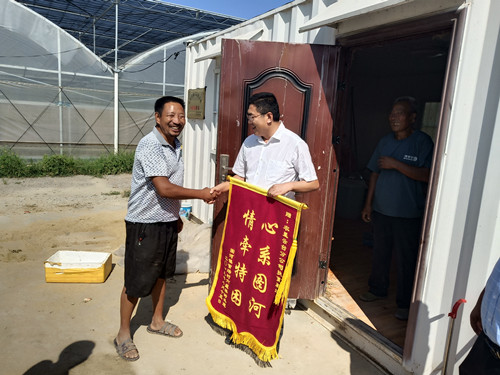 8月19日上午,家住灌云縣圖河鎮官場村的特困農戶林樹其,來到由蘇墾農發云臺分公司實施興建的江蘇農墾產業幫扶圖河豆丹養殖基地,向分公司總經理宋光鋒獻上寫有“心系圖河 情牽特困”字樣的錦旗,表達他對基地今年以來無私傳授豆丹養殖技術,幫扶他一年實現脫貧致富的感激之情。