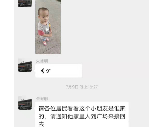 于是朱峰明掏出手機拍下了小男孩的照片,發到了城東、城西和城南居委會的三個微信群里,并連發了三條信息:“請各位居民看看這個小朋友是誰家的,請通知他家里人到廣場來接回去。”