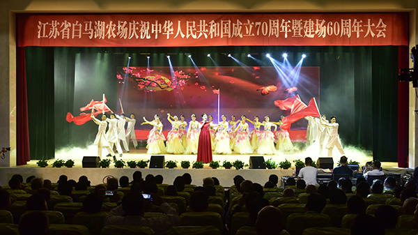 9月23日,在節日般的喜慶氛圍中,白馬湖農場有限公司干部職工代表和特邀嘉賓共450人歡聚一堂召開慶祝大會,共同慶祝中華人民共和國成立70周年暨白馬湖農場建場60周年。集團公司總經理、蘇墾農發董事長胡兆輝,淮安區委書記徐子佳出席并講話,白馬湖農場公司黨委書記、董事長、總經理姚春華致辭,黨委副書記韓正光主持大會。