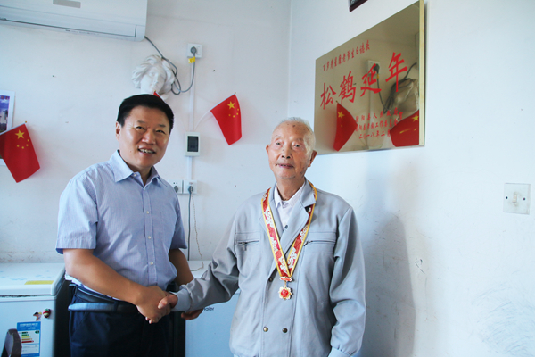 董事長、總經理潘元海到潘序銀老人家中探望,緊握老人雙手與老人親切交談,“感謝他對祖國作出的貢獻,更感謝他為新洋發展作出的不懈努力。”言談間親自為老人戴上紀念章,并仔細詢問老人的身體狀況,叮囑老人保重好身體。