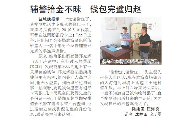 自淮海農場有限公司從今年7月份開展第五屆文明新事征集、評選以來,進一步激發了農場公司職工居民踐行文明新事,爭當淮海好人的氛圍。近來,我們從刊登鹽城晚報上獲悉,自9月份以來,已經有3篇反映淮海農場有限公司的職工居民做好人好事的文章,刊載在鹽城晚報上,這些文章分別是,9月10日:《城管隊員幫兩走失小孩找到家人》;9月15日:《民警相助尋親路 失散20多年的姐弟團聚》;9月25日:《輔警拾金不昧 錢包完璧歸趙》等三篇文章,彰顯了文明新事已經在淮海大地上蔚然成風。圖為刊登在鹽城晚報上這三篇好人好事報紙截圖及三篇報道稿。