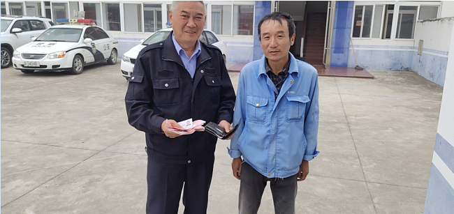 “早上打掃馬路時,在社區(qū)旁的廁所前撿到一個黑色錢包,打開一看,里邊有一沓現(xiàn)金和銀行卡。”姜兆華敘說著當(dāng)時的情況,“我想天剛蒙蒙亮,派出所還沒有上班,周圍也看不到人,他就繼續(xù)沿著路途清掃包干區(qū)的路面。等我所有路段的工作完成后,就來到派出所來求助尋找失主。”