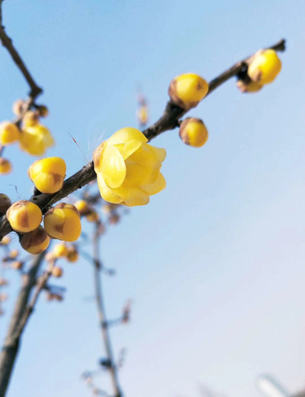 記得小學四年級的時候,放學和小伙伴們一路打打鬧鬧回家,路上突然一陣清香襲來,四下尋找,看到盛放的臘梅,花瓣金黃通透,在陽光下自帶光芒,那時候的喜歡就是單純想要擁有,小伙伴們都抬著頭尋找著花朵最多的一枝,蹦跳著折下,往家走的路上,還不忘把花湊近鼻尖聞,那是最簡單的小歡喜。一到家,我便把臘梅花放入花瓶中加上水,也是神奇的緣分,幾天后這支臘梅花生根了,我興奮地告訴每一個看它的人,那是人生第一次感受到“無心插柳柳成蔭”的欣喜,即使后來臘梅花開敗了,也時不時地跑去瞧瞧它的新葉。很久以后,我才知道,臘梅扦插的成活率并不高。 這兩株臘梅樹,雖然我記不清它的年齡,但似乎從我有記憶開始,它就一直在那里,陪伴我從童年到工作,從認字讀音到長大成人,時光飛快,一晃已是十幾年,它是我愛種綠植,愛買鮮花的溯源,我很怕天寒地凍的季節,但每年天氣到變冷的時候,便又開始期待和它們一年一次幸福的約會,感謝它每一年冬天的如約而至,感謝它溫暖我的童年記憶,感謝它依然還在。現在的我再愛花,也懂得惜花,好不容易盼到花期到來時,只會靜靜地佇立樹下,細聞花香,和更多的人分享這份完整的美好,不再幼稚,辣手摧花。