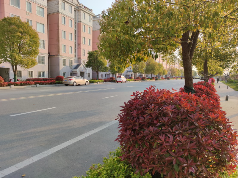 淮海路全長1000米,道路兩邊的綠化帶分別栽種的香樟、紫微、石楠球、石楠隔離欄等。如今,無論是站在淮海路的哪一處向兩邊望去,石楠的紅、石楠的綠,香樟樹的綠、香樟樹的黃,交錯在道路兩側,讓人感到其色彩明亮而莊重。特別是在陽光照耀明亮的日子、其路旁的色彩總是熱烈著,溫暖著心靈。樹木的色彩與周邊的建筑融合在一起,就如彩色的“調色盤”,為淮海涂抹著艷麗的色彩,從而也形成了淮海路中錯落有致的美麗景觀,讓大家置身在其中,感受到了春天那五彩斑斕,美不勝收。