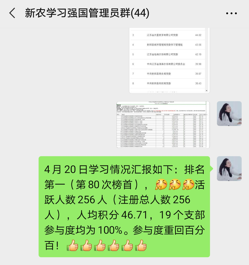 “4月20日學習情況匯報如下:排名第一(第80次榜首),活躍人數256人(注冊總人數256人),人均積分46.71,19個支部參與度均為100%。”21日上午,這一消息在微信群內發布。自1月1日至4月20日,新洋已累計80次、連續33次蟬聯射陽縣56個同級黨委排名榜首。