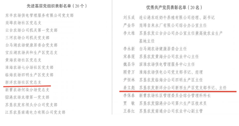近日,在江蘇農墾全面從嚴治黨工作會議暨巡察工作動員會議上,集團公司黨委表彰了江蘇農墾優秀共產黨員、優秀黨務工作者、優秀黨組織書記、先進基層黨組織。新洋農場社區黨總支榮獲江蘇農墾“先進基層黨組織”榮譽稱號,姜立彪同志榮獲江蘇農墾“優秀共產黨員”榮譽稱號,