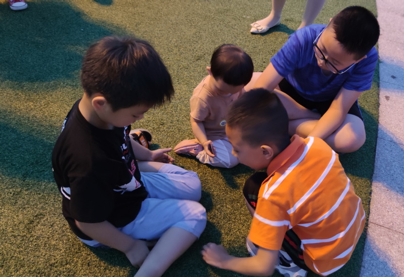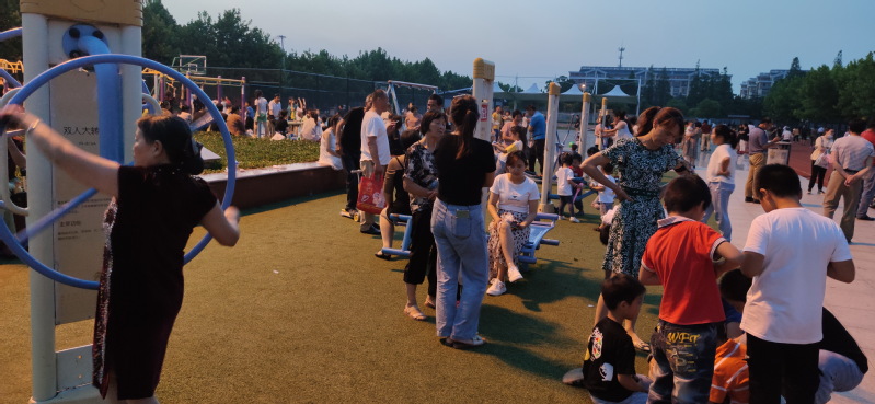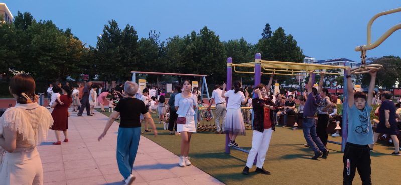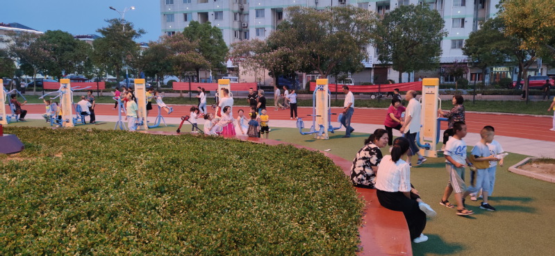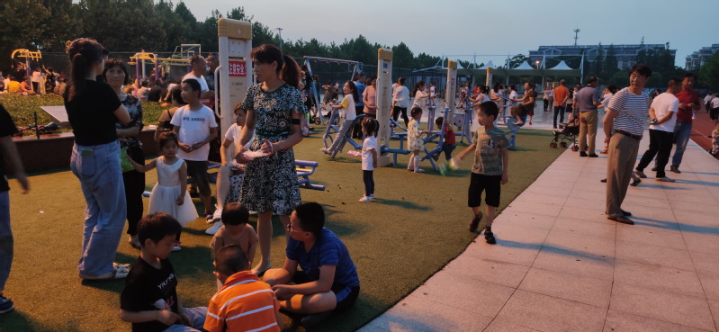 淮海職工休閑體育運動廣場是農場人氣最旺盛的健康體育運動廣場,不僅農場的職工居民和周邊農村群眾趨之若鶩,紛至沓來地來到這里進行各類健康體育運動,進行鍛煉身體、休閑養生。這里也是職工群眾最喜愛游玩的好去處。不僅成年人喜歡,也是孩子們的樂園。昨天晚上我們看到,在廣場上的健身器材區域,是孩子們最喜愛的地方,這里不僅有孩子們喜歡的健身器材玩,并且地面鋪設的塑膠地面,也讓他們在上邊開心的玩耍著。你看,那些小孩子們團坐在地上,玩著摜紙片的游戲,多專注;那邊幾個孩子們一同說著悄悄話,多悠閑;健身器材上的幾個孩子像模像樣地擺弄著器材,鍛煉著身體;還有許多幼童在家長們的監護下,進行交流或是玩耍。廣場上到處都散發著童稚的芬芳和蓬勃的氣息。
