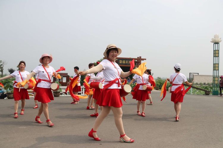 2017年5月8日,22人,平均年齡60歲的“舞哥腰鼓隊(duì)”統(tǒng)一穿著紅服裝、掛著紅腰鼓,在寶應(yīng)湖農(nóng)場(chǎng)職工文化廣場(chǎng)進(jìn)行練習(xí)。沒(méi)有指導(dǎo)老師,他們自己學(xué)。會(huì)上網(wǎng)的顧曉萍從網(wǎng)上找來(lái)視頻,先自己學(xué)會(huì),再手把手地教隊(duì)員。