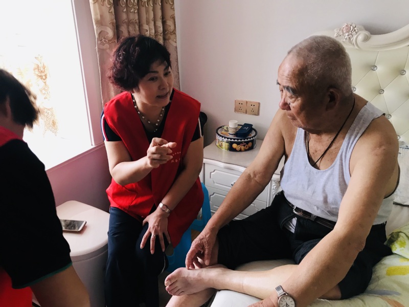 在8月7日金實銀康的新老員工一行9人,先后深入到4戶80多歲的老同志們的家中,對他們宣傳居家養老的服務政策,并與老人們談心、合影、洗腳、修剪手指腳趾甲等服務,還愉快地帶領著老人們做起的手指操表演,讓老人們開心不已,希望他們今后還走進家庭,陪老人們做些居家養老方面的體驗和服務。圖為金實銀康居家養老服務人員在居民家中進行服務。