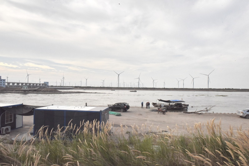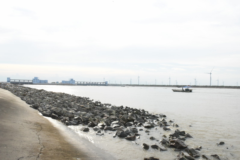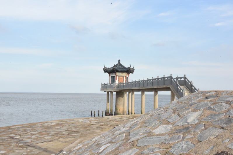 農場的東海岸,原是一個不起眼的扁擔港,因地勢不滑,沒有深水的場所,所以以前當地人出海時,就會選擇把魚具等物品挑進去,用扁擔再把海產品挑出來,所以久而久之就稱之為扁擔港。后因蘇北灌溉總渠的竣工和海口閘的先后興建,通過多年來的建設,在南側的蘇北灌溉總渠的海邊出現了蜿蜒淺流的水道;而在北側則是非常壯觀的海口閘,內側是清水透徹的河水,外側則是黃濁濁的海水,并在排水中的不斷碰撞中融合在了一起,那些隨河水而下的魚類則難以忍受這種環境,在不斷的顛簸中流入海中或是成為人們的美食。那些海邊的燈塔、一字排開的擋浪水泥桿、搖曳的大風車和深入到海水中的亭臺,無不成了觀賞風景中的唯美角色。