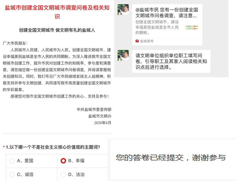 活動(dòng)中,公司文明辦工作人員向職工居民宣傳鹽城市創(chuàng)建全國文明城市的意義和創(chuàng)建取得的成效,宣傳人人共享文明創(chuàng)建成果的益處,并在職工微信群中推送調(diào)查問卷鏈接,動(dòng)員居民積極參與到鹽城市全國文明城市創(chuàng)建工作中來。此項(xiàng)工作受到了全場(chǎng)職工群眾的普遍歡迎,大家對(duì)鹽城市創(chuàng)建全國文明城市很有信心,紛紛表示要用自己的實(shí)際行動(dòng)去影響身邊的人,帶動(dòng)家人爭創(chuàng)文明家庭,爭做文明居民,為創(chuàng)建文明城市貢獻(xiàn)出自己的力量。