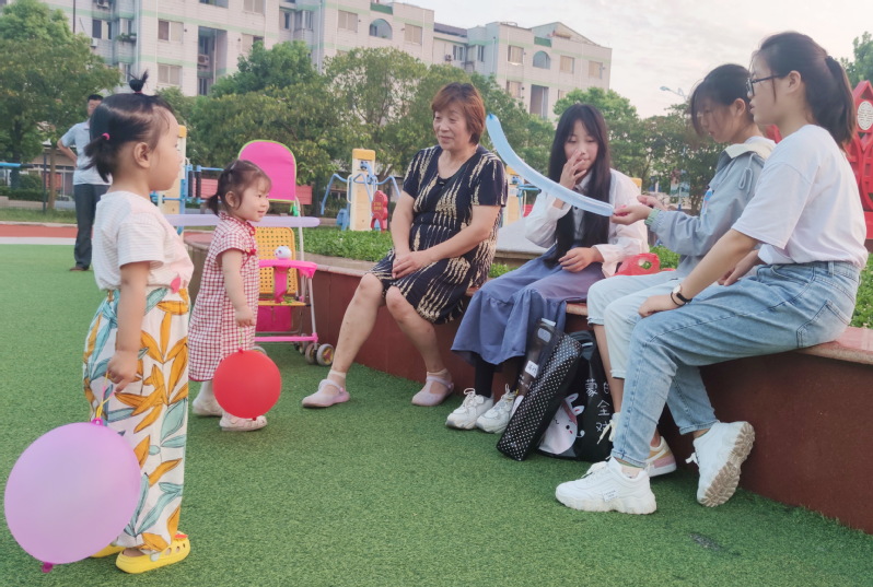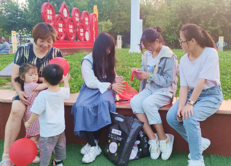 9月4日傍晚,在淮海農(nóng)場(chǎng)職工休閑體育運(yùn)動(dòng)廣場(chǎng)健身器材包裹的橢圓形的大理石上,由淮海農(nóng)場(chǎng)中學(xué)的三名學(xué)生正坐在上面一邊吹著氣球、一邊把色彩斑斕的氣球或是氣棒派送到前來索要的寶媽寶奶或是寶寶的手中,并以此來鍛煉體驗(yàn)與社會(huì)交往的能力,并在人際交往中奉獻(xiàn)愛心,體味人性的溫暖。
