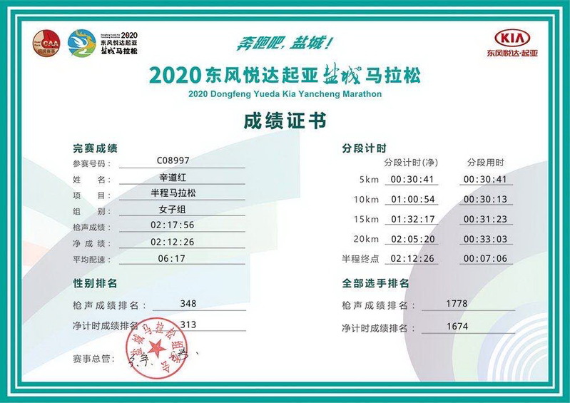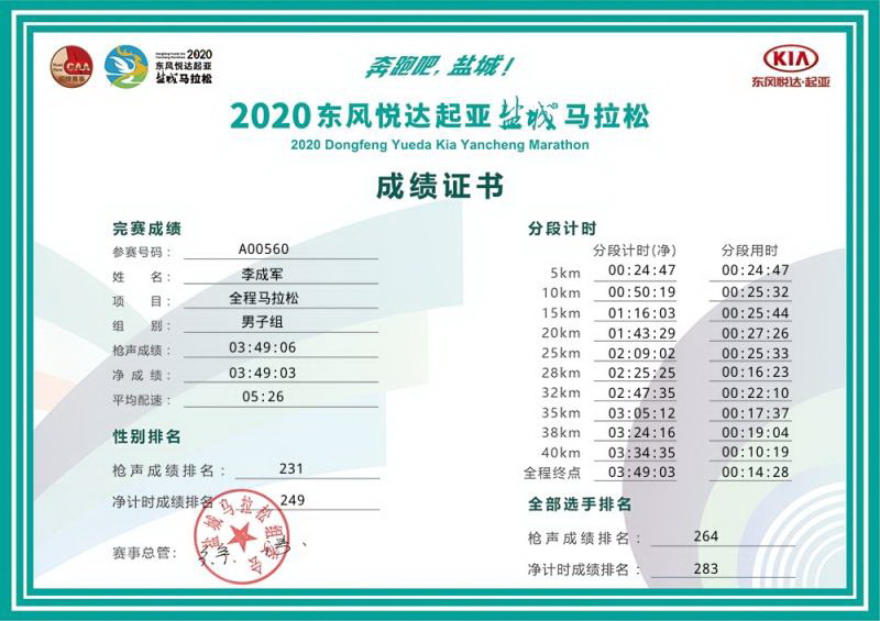 在本次2020鹽城馬拉松比賽中,男子全程馬拉松選手李成軍以凈計(jì)時(shí)排名249,凈成績(jī)3小時(shí)49分零3秒的時(shí)長(zhǎng)和5分26秒每公里配速;男女半程馬拉松選手高善文、辛道紅分別以66名、313名的凈計(jì)時(shí)排名,1小時(shí)34分36秒和2小時(shí)12分26秒的凈成績(jī),4分29秒和6分17秒每公里的配速,讓農(nóng)場(chǎng)參與馬拉松比賽的不少跑者自嘆不如。