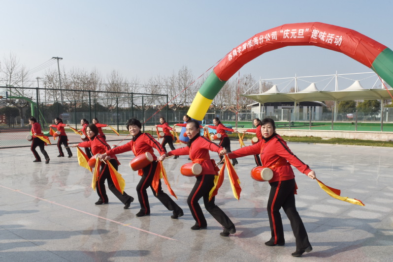 為迎接2021新春元旦的到來,幫助蘇墾農發淮海分公司和淮海農場公司工會營造趣味運動會的氣氛,由淮海海之韻舞蹈隊這支平均年齡在57歲的12名隊員,義務為企業進行鼓舞趣味運動會的開場舞表演,并以擊鼓舞蹈的形式,為參賽節目助興,給現場近500名參賽選手和職工群眾營造出了濃郁的節日氛圍。