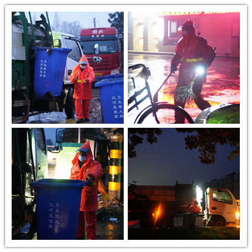 319日凌晨五點,三河街道兩側的垃圾轉運點,一閃一閃的車燈雙跳尤其亮眼,車燈,手電筒燈光,桔黃色的環衛衣交織成一道光的風景。