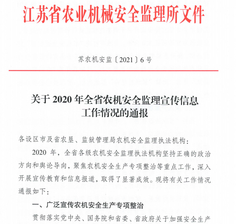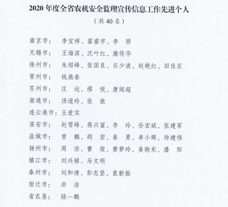 在近日江蘇省農(nóng)業(yè)機(jī)械安全監(jiān)理所發(fā)布的2021年第6號(hào)文件《關(guān)于2020年全省農(nóng)機(jī)安全監(jiān)理宣傳工作情況的通報(bào)》中,有40名同志獲得了全省農(nóng)機(jī)安全監(jiān)理宣傳信息工作先進(jìn)個(gè)人,其中江蘇農(nóng)墾陸一鵬作為墾區(qū)唯一的通訊員,因?yàn)樵谵r(nóng)機(jī)監(jiān)理宣傳信息工作中成效顯著,獲得了表彰。