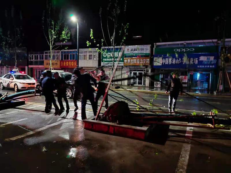 為第一時間了解災情,新洋農場有限公司第一時間啟動應急響應,在公司副總經理田峰秀帶領下,30日晚上7點30分風雨小一些后,工會、社區、林發公司等單位工作人員全面出動進行救災工作,清點受損情況,并對農場境內緯四路等主要道路上的樹木進行清理,對重點積水部位實施積水強排。并通過微信群、電視滾動屏幕加大宣傳,提醒職工居民盡量不要外出,如果外出盡量不要靠近路燈桿,經水漫過電線桿接線處容易漏電,防止觸電事故的發生。