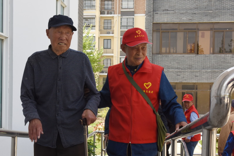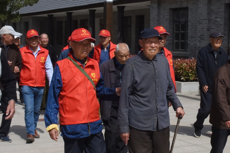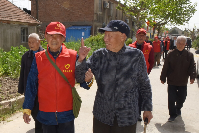 58日下午2點多鐘,一名剛跨入80歲這個耄耋年齡段的黨員林耀國,以淮海農場社區城西居委會黨支部的一名志愿者的身份,陪伴性地攙著一位95歲的老軍墾戰士魏廣友,同其他15名平均年齡達90歲的原中國人民解放軍農業建設第四師的老戰士們一起,來到城西支部上黨史學習教育課,課后并到當年的農建四師師部舊址上,瞻仰紀念碑、聆聽主席令、參觀陳列館,幫助老軍墾在尋找、敘說曾經的記憶和榮耀過程中,踐行黨的歷史,并以此來不忘初心,牢記使命,更好地講好淮海紅色故事,傳承好農建四師精神,讓軍墾精神在淮海農場大地上發揚光大圖為穿著志愿者服裝的林耀國老人在陪伴老人行進時的鏡頭。