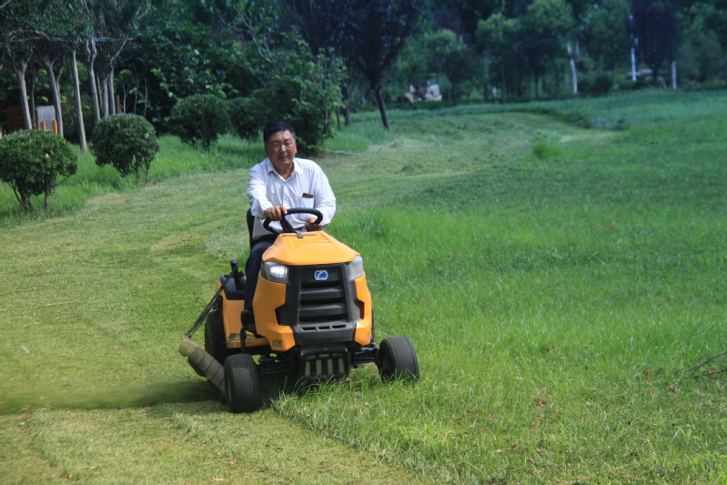 圖為園林工人正在修剪草坪