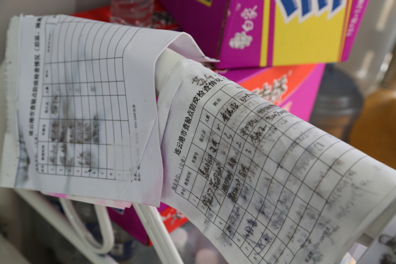 在王溝卡口點,許多車輛信息登記表晾在床板上,當你仔細一瞧會發現,字跡不少已經被雨水浸泡模糊。執勤人員說,今天雨一直在下,但是執勤力度不減,只好一邊登記一邊擦拭雨水。