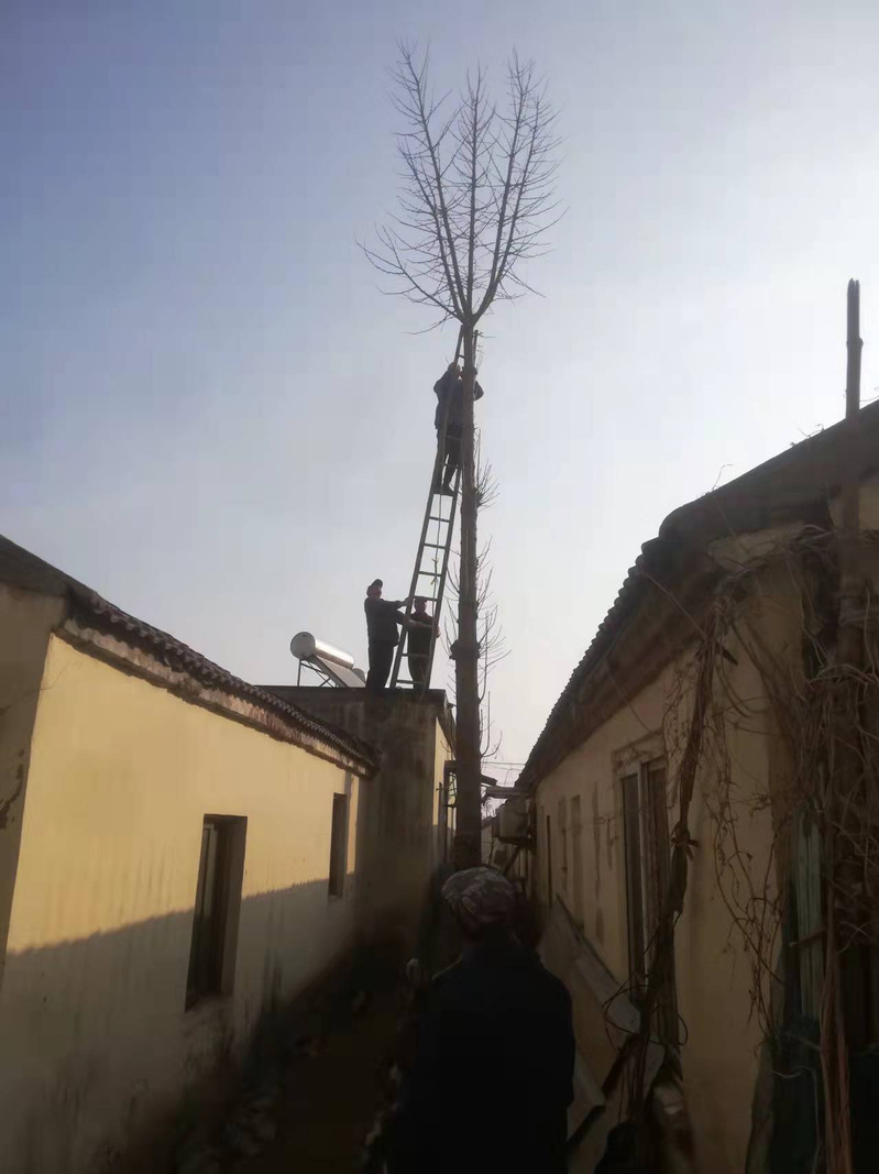3月9日上午8時(shí),按照事先制定的方案,由農(nóng)場(chǎng)社區(qū)環(huán)綠所所長張海濤帶隊(duì),城西居委會(huì)協(xié)助,和環(huán)綠所員工一行7人來到幸福小區(qū)。首先對(duì)最高最粗最難砍伐的銀杏樹進(jìn)行砍伐。為防止大樹倒下砸壞兩邊房屋,有砍伐經(jīng)驗(yàn)的環(huán)綠所老員工李素兵現(xiàn)場(chǎng)提出:“從上到下,分段砍伐?!痹谡鞯脧埶L及眾人的同意后,李素兵立馬系好安全帶攀上樹頂,用手工鋸將銀杏樹頂端的叉枝逐個(gè)鋸掉,然后又用電鋸將銀杏樹從上到下分4段切割,最終平穩(wěn)將銀杏樹砍伐。緊接著一行人又來到另兩顆樹的地方,用同樣的方式,互相協(xié)作,很快又將兩顆樹砍伐?,F(xiàn)場(chǎng)圍觀的居民群眾對(duì)砍伐房前屋后到三顆樹個(gè)個(gè)拍手稱快。李志明老夫婦倆看到自家廚房后面10多米高的銀杏樹被伐,說了一句:“從今往后總算能睡個(gè)安穩(wěn)覺了,謝謝大家,謝謝!謝謝……”