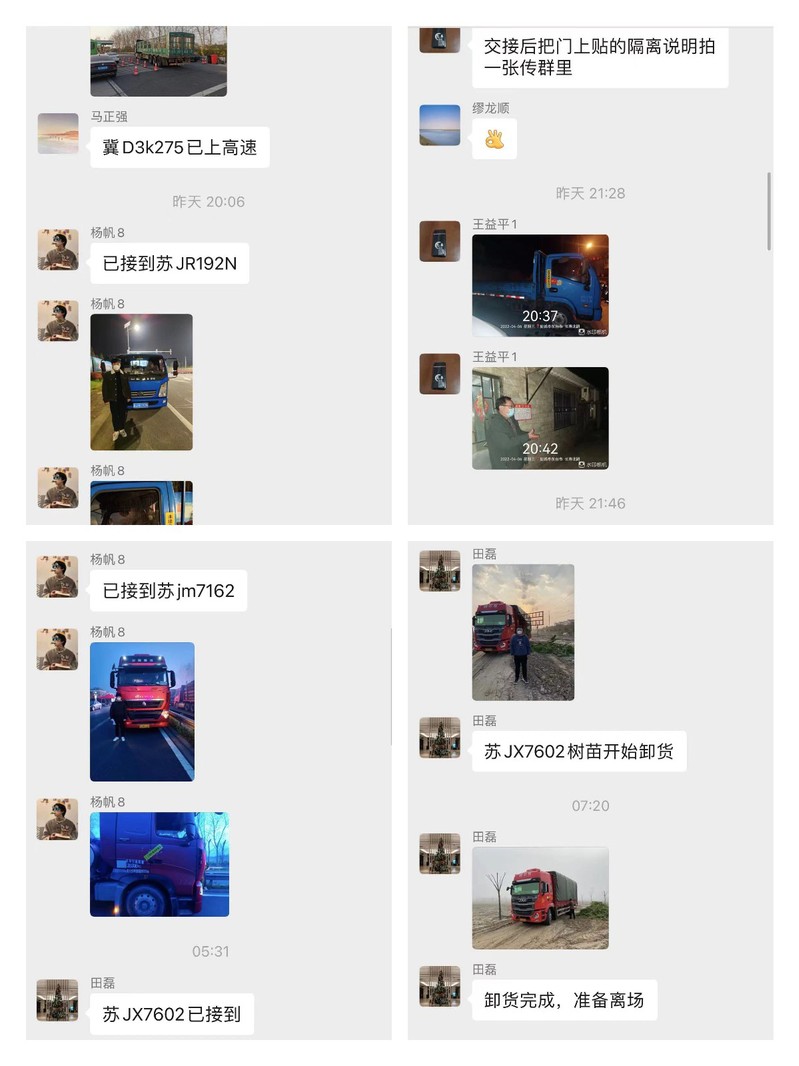 “冀D3k275已上高速”“已接到蘇JR192N”“空車回場,行程碼無星號,居家隔離”“蘇JX7602樹苗開始卸貨”……弶港農場“疫”線黨員突擊隊微信群里的工作匯報內容簡短,工作流程圖像清晰,值班人員和應急小組24小時在線,全力為場域內企業企業穩產保供保駕護航。