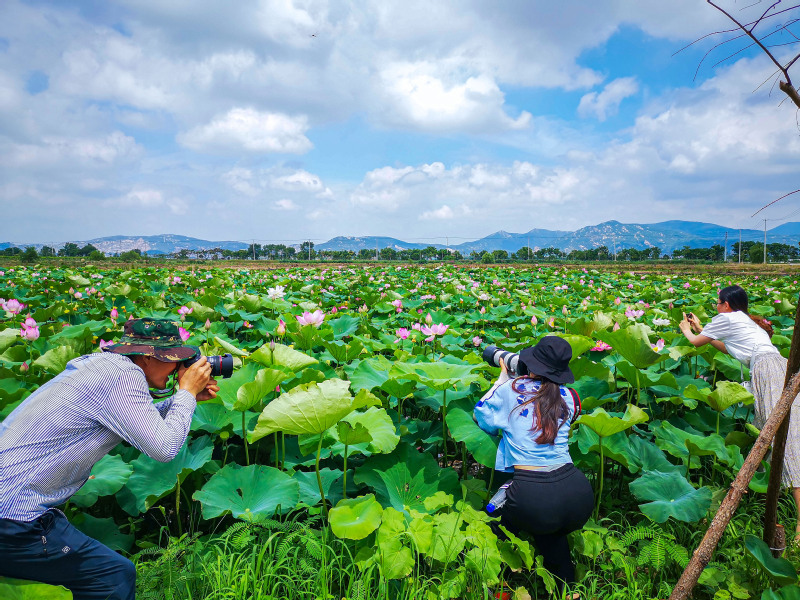 市區(qū)為“荷”而來的游客穿行在荷田之中,邊聞著沁人的花香,邊用攝影設(shè)備興致勃勃地拍照,大家不斷地調(diào)整角度、尋找機(jī)位,只為拍攝出荷花最傲人的身姿。