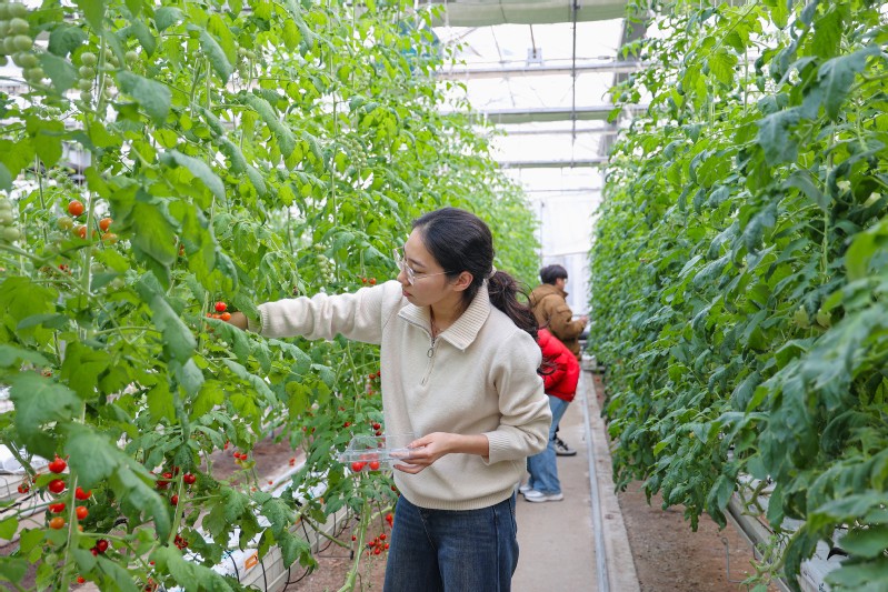 2月12日,在連云港市云臺農(nóng)場興墾科技番茄采摘智能玻璃溫室大棚內(nèi),工作人員在采摘采用無土栽培技術(shù)種植的西紅柿。 吳成瑤 攝 (視覺江蘇網(wǎng)供圖)