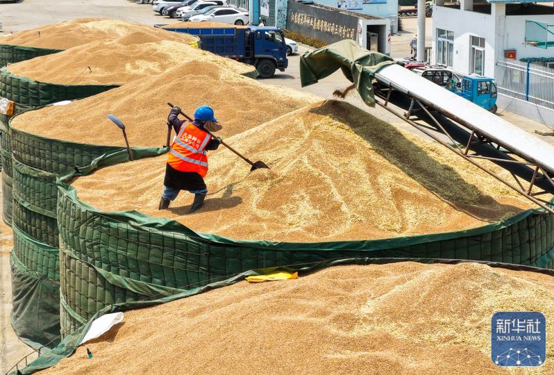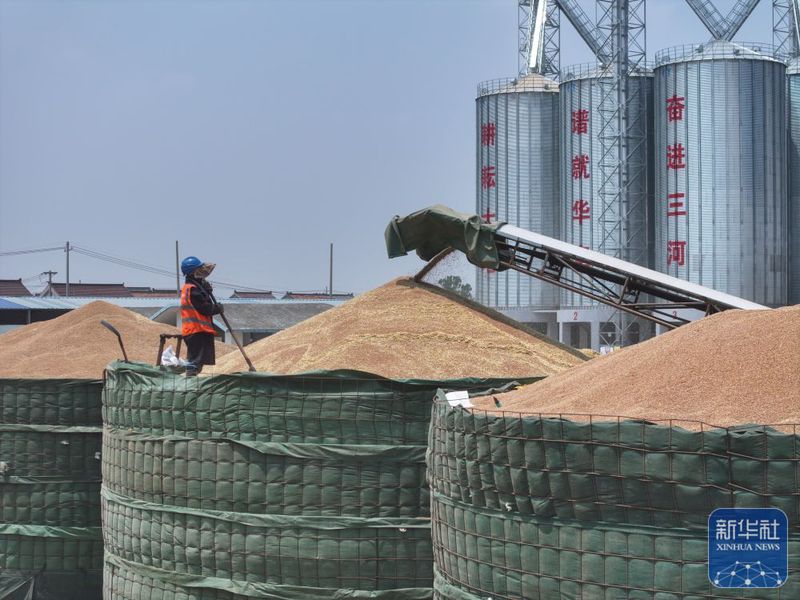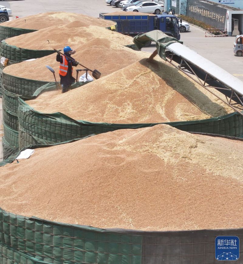 三河農(nóng)場收獲的小麥進入大華種業(yè)三河分公司存儲(5月28日攝,無人機照片)。新華社記者 季春鵬 攝