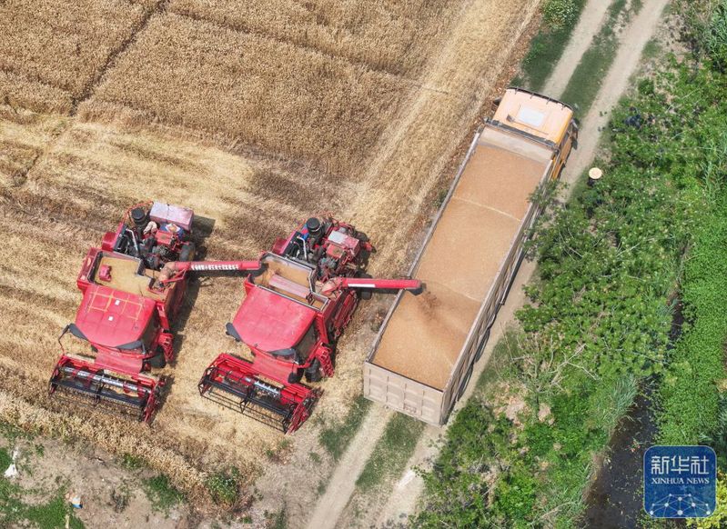 三河農(nóng)場收獲的小麥進入大華種業(yè)三河分公司存儲(5月28日攝,無人機照片)。新華社發(fā)(許昌銀攝)