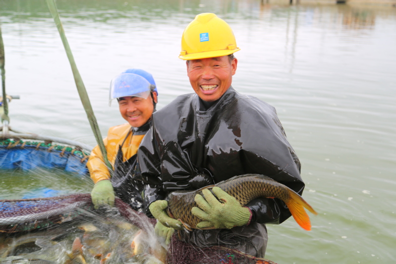 正值淡水魚出塘上市季節(jié),江蘇省連云港市海州區(qū)江蘇農(nóng)墾崗埠農(nóng)場南漁場,大型吊車正在起網(wǎng)捕撈鯉魚,一幅人歡魚躍的水上夏收景象。圖為漁民在展示捕撈的大鯉魚。 徐衛(wèi) 攝(來源:大國三農(nóng))
