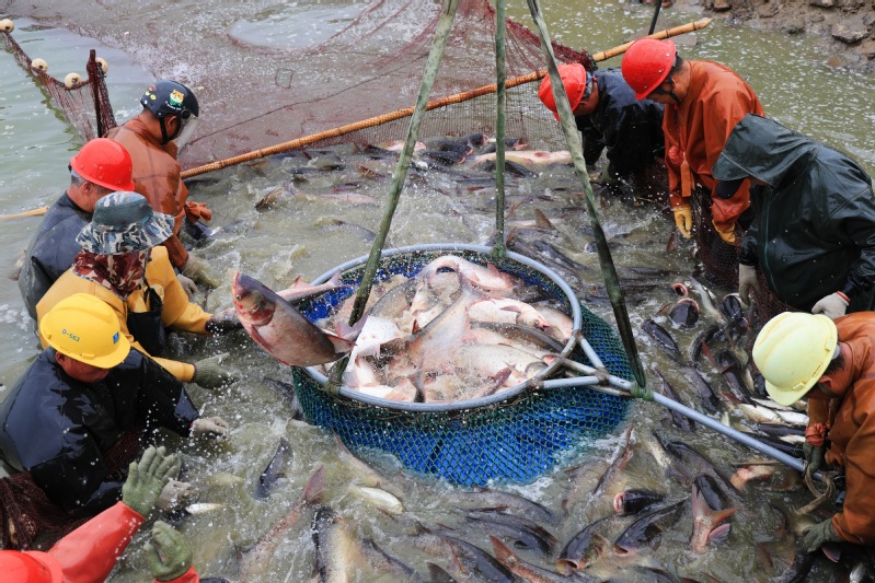 9月15日,江蘇省連云港市海州區的江蘇農墾崗埠農場,水產工人們在魚塘里拉網捕撈分揀花鰱、白鰱等水產品,準備發往周邊市場銷售。