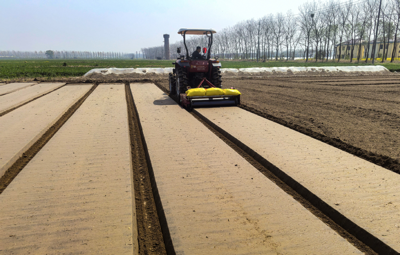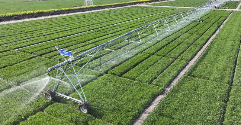 蘇墾農發白馬湖分公司利用智慧農機加強小麥管護,圖為農機手操作平行行走式水肥藥一體機在麥田施肥。
