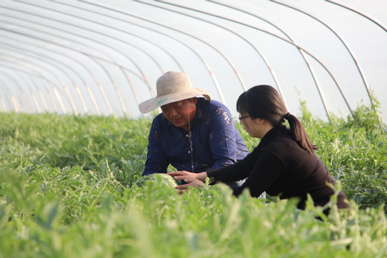日前,江心沙農場的西瓜陸續進入批量上市階段。圖為江心有田分公司黨支部書記周璐璐逐一走訪西瓜種植戶,仔細查看西瓜的長勢、品相和成熟度,為批量采摘和定點供應再檢驗、再把關。