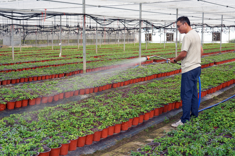 初秋時節(jié),走進新洋農(nóng)場容器苗項目基地,素有“百日紅”之稱的紫薇花進入了盛花期。基地管理人員梁亞洲正在為紫薇花瓶噴施營養(yǎng)液,順手修剪掉雜枝,為紫薇健康生長提供保障。紫薇花期長,是觀花、觀干、觀根的盆景良材,一棵培育良好、株高2米的紫薇花瓶容器苗木市場價可達2000元以上,具有良好的經(jīng)濟效益和景觀效果。“針對秋季紫薇生長特點,我們還集中對紫薇進行了抹芽、修枝、除草,保證苗木生長良好、發(fā)育健壯、形狀優(yōu)美。”梁亞洲說,紫薇是一種綠化點綴效果很好的觀賞苗木,尤其是夏秋季道路綠化開花小喬木不多,紫薇正好填補了這個季節(jié)的空白。2020年以來,新洋建成配有溫室大棚、水肥一體、智能控制、基質配方、節(jié)水灌溉等設備的容器苗圃200畝,主打球類、造型類、花喬類等綠化苗木產(chǎn)品近萬株。在栽培方式上,林業(yè)公司大膽嘗試,自行研發(fā)優(yōu)化不同容器苗基質配比,開展扦插培育試驗,實現(xiàn)了自繁自育栽培技術的新突破。“這黑色薄膜包裹的是控根器,由于現(xiàn)在溫度較高,水分蒸發(fā)快,容器苗基質易缺水,要及時引水灌溉,濕透苗床,以保持土壤濕潤。”林業(yè)公司副總經(jīng)理蔡仿介紹,針對當前溫度過高的情況,管理人員在后臺打開自動化噴淋設備,一體化水肥系統(tǒng)在