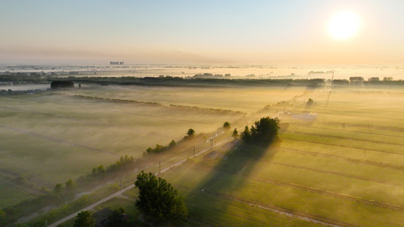 稻田秋霧朝陽下的秋霧晨光下的稻田與村落晨露與稻田稻穗楊花金秋,清晨,白馬湖境內晨霧彌漫,稻田、鄉道、朝陽、樹木、溝渠等若隱若現,“勾畫”出一幅和美鄉村的美麗畫卷。陽光下,霧氣散,空氣中彌漫著清新的稻花香。俯瞰蔥綠的稻田,如一條條綠絲帶整齊排列。晶瑩的晨露凝結在青翠的秧苗上,猶如給稻田蒙上了一層剔透的面紗。剛抽出的稻穗上,有白色的稻花點點,隨著稻穗一起隨風輕舞飛揚。小蜘蛛也趕來湊個熱鬧,在枝葉上織起了“秋的毛衣”。