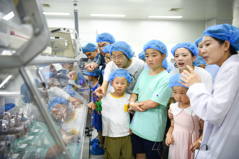 云港連夏荷,晴天正秋風。8月20日,正大天晴第二季“愛在天晴 家倍美好”家庭活動日在連云港廠區(qū)舉辦。開幕式上,人力資源中心總監(jiān)代表公司向在企業(yè)發(fā)展中辛勤付出的天晴人及其背后的家人表示感謝,同時宣布自2024年起,正大天晴將增設“高考陪考假”,切實將公司的“六為文化”及“家文化”傳遞給每一位勤奮拼搏的天晴人。儀式上,公司代表為即將開啟大學生活的“晴二代”們送上升學祝賀、頒發(fā)獎學金。伴隨著熱烈的掌聲和飛向天際的氣球,第二季家庭日活動在歡聲笑語中正式開啟。在研究院,小朋友們在研發(fā)人員的指導下,小心翼翼地將白色乳糖粉末填充到膠囊殼中。往常見到都要躲著走的膠囊,這一刻卻成了愛不釋手的小寶貝。在精心準備的化學小試驗中,生活中常見的醋、雪碧,都有自己專屬的“酸堿色”。玻璃瓶中的五顏六色激起了孩子們的好奇心和求知欲,也在他們心中播下了一顆探索的種子。在生產車間,小朋友們隔著護欄近距離地觀看正在作業(yè)的機械臂,伸展、抓取、轉身、放置……機械手臂行云流水般的動作讓他們發(fā)出陣陣驚嘆。在大型生產設備前,孩子們全神貫注地聽著講解?,F(xiàn)代化藥物生產車間在小朋友眼里像極了鎧甲勇士的基地,置身其中,像是一腳踏進了特攝片的