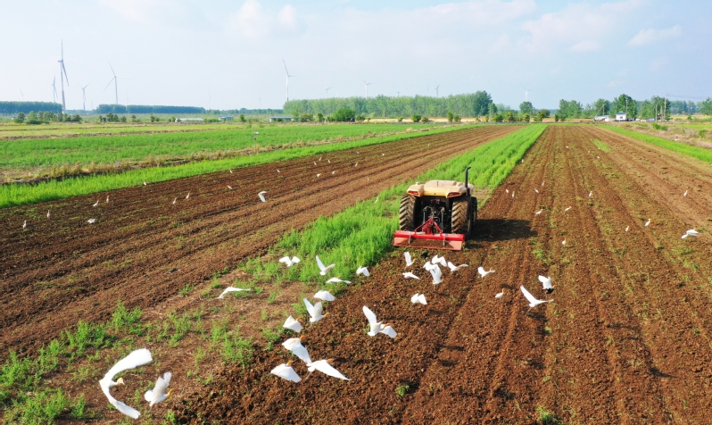 在蘇墾農(nóng)發(fā)東辛分公司的田間地頭,大豆玉米復(fù)合種植精量播種機(jī)緩緩駛?cè)臌溙铮行蛲瓿刹シN、隔斷施肥等一體化作業(yè)。